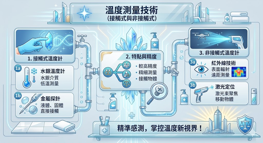 - 水銀溫度計:使用水銀作為測量介質,常見於低溫環境的測量。